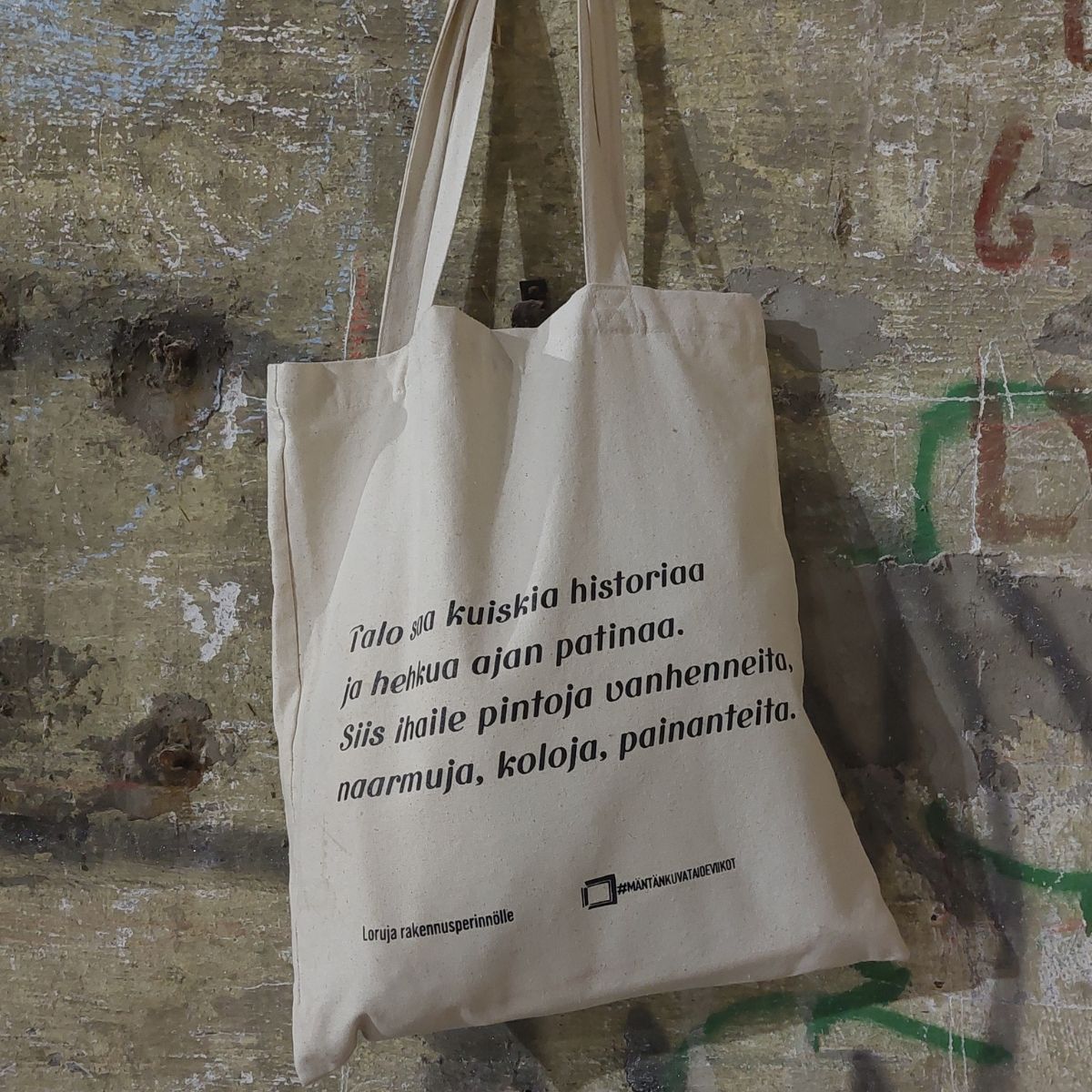 "Loruja rakennusperinnölle" koostuu kangaskasseille painetuista rakennussuojeluaiheisista riimiloruista, eräänlaisesta käyttölyriikasta.